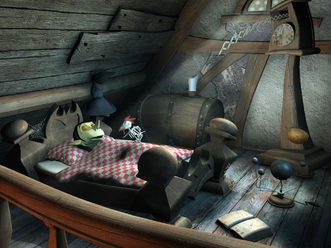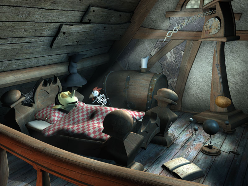 Das ist Primus, die Hauptfigur des Buches in seiner Dachkammer. Neben ihm auf dem Bett sitzt sein Freund, das Hühnerskelett Buckleweeh. Primus liebt Kuchen, verdreht gerne Wegweiser und kann sich in eine Fledermaus verwandeln. Später freunden sie sich mit der wortgewandten Hexe Miss Plim an.